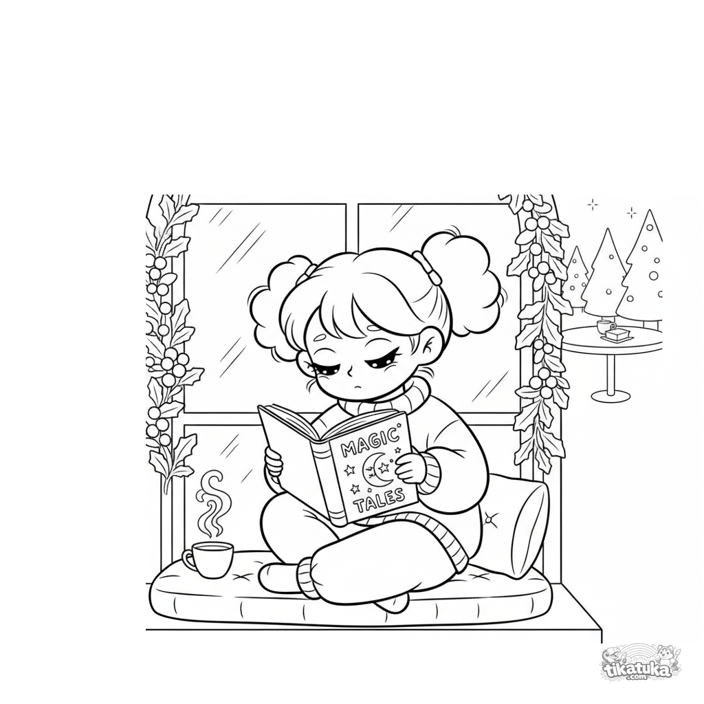 Ausmalbild für Mädchen 7-9: Ein Mädchen kuschelt sich in ein Fensterbank-Sitzkissen in einem Festtagssaal und liest ein großes Buch. Eine ruhige, detaillierte Szene.