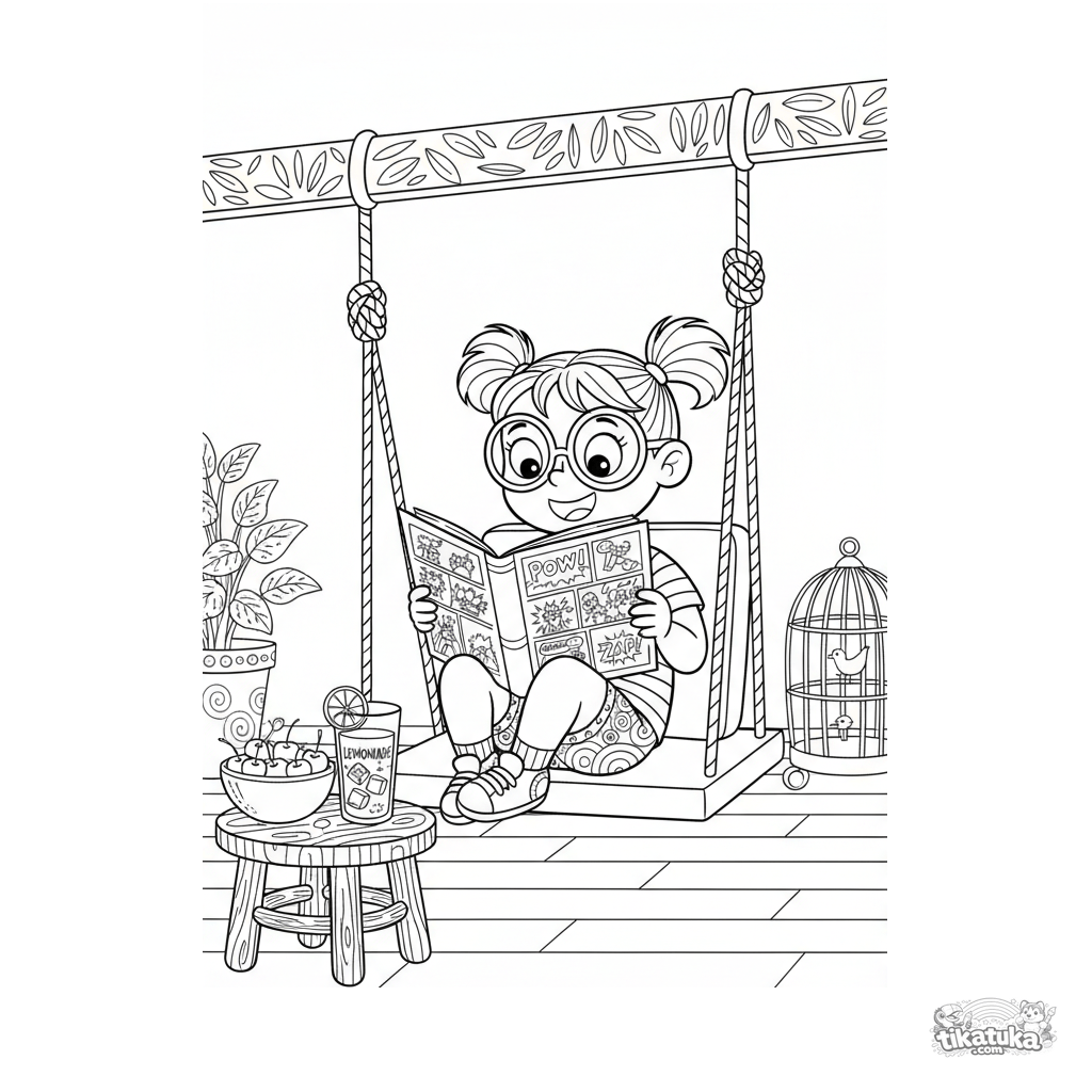 Detailliertes Ausmalbild für 10-12 Jahre: Ein Mädchen liest einen Comic, gemütlich in einer Verandaschaukel. 90er-Jahre-Stil, komplexe Szene.