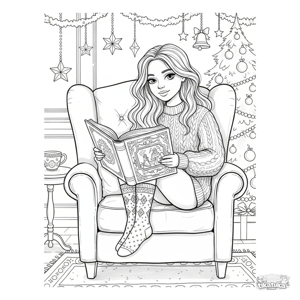 Ausmalbild für ältere Kinder 10-12: Ein Mädchen liest ein Riesenbuch in einer gemütlichen Ecke einer Festhalle. Detaillierte Szene.