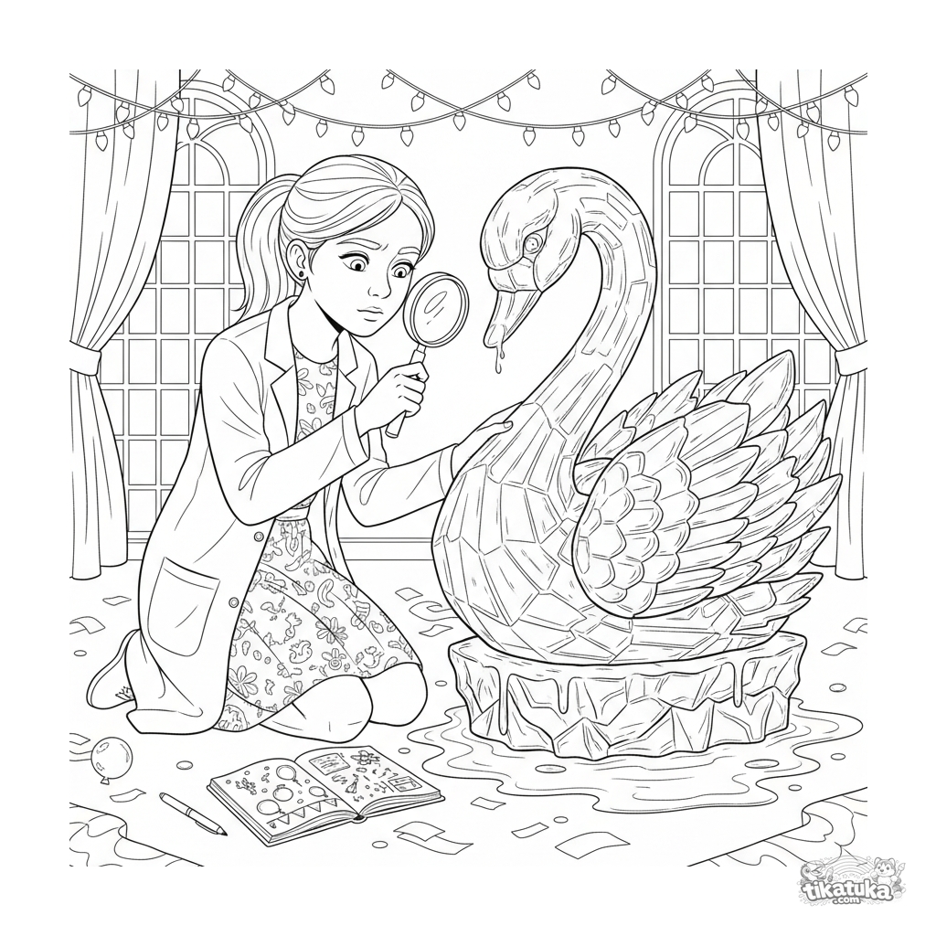 Ausmalbild für Kinder 10-12: Ein Mädchen im Laborkok mit Lupe untersucht eine schmelzende Eisskulptur eines Schwans in einer Festhalle. Detaillierte Linien, breite Ränder.