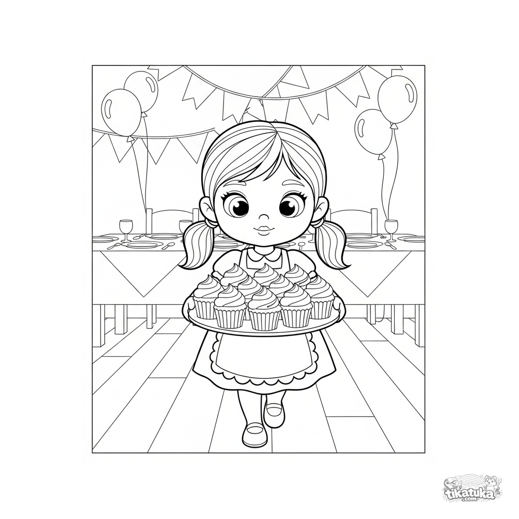 Ausmalbild für Kinder 4-6 Jahre: Ein Mädchen mit Schürze trägt vorsichtig ein Tablett mit Cupcakes in einer dekorierten Festhalle. Mit Party-Tisch und Girlanden im Hintergrund.