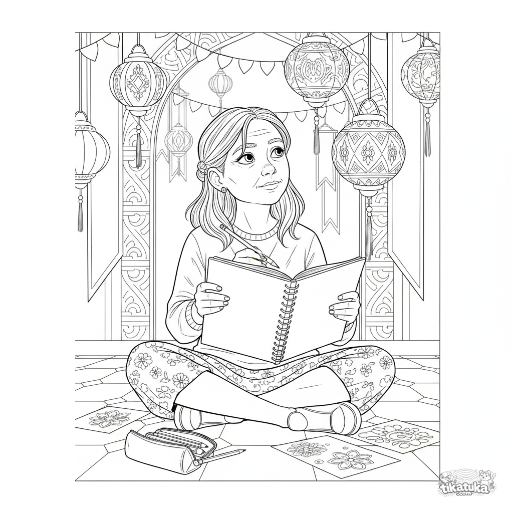 Ausmalbild für Kinder 10-12 Jahre: Ein Mädchen sitzt auf dem Boden des festlichen Saals und skizziert Dekorationsideen in einem großen Skizzenbuch. Detaillierte Szene.