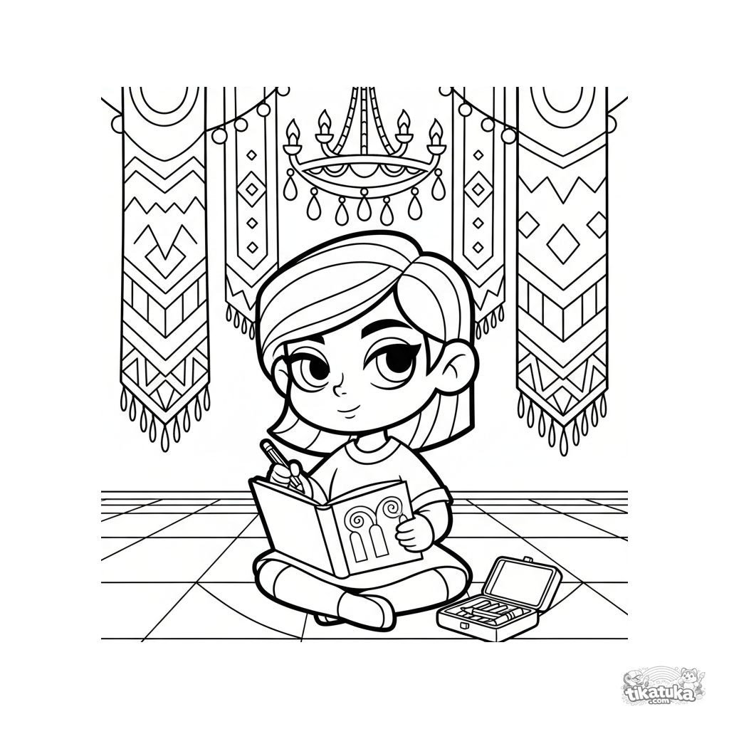 Ausmalbild für Kinder 7-9: Ein künstlerisches Mädchen zeichnet die Dekorationen einer Festhalle in ihr Skizzenbuch. Kreative Szene.