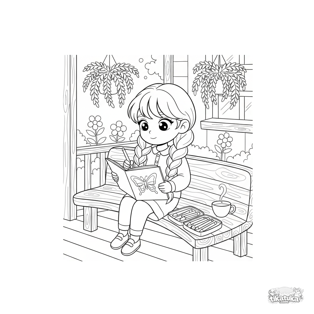 Ausmalbild für Kinder 7-9: Ein Mädchen skizziert einen Schmetterling in ein Notizbuch, auf einer Ferienhausverandabank sitzend. Kreative, ruhige Szene.