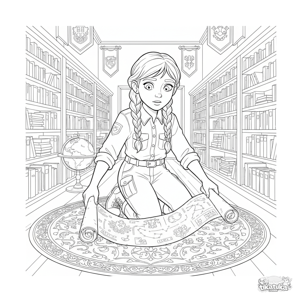 Ausmalbild für ältere Kinder 10-12: Ein Forschermädchen rollt eine alte Schriftrolle in einem Bibliothekssaal aus.