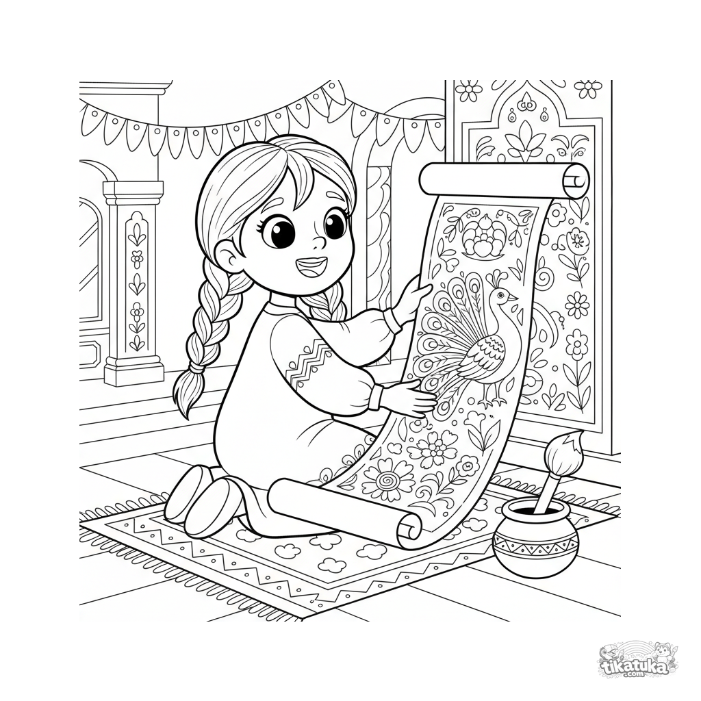 Ausmalbild für Kinder von 7-9 Jahren: Ein Mädchen im Folk-Stil rollt eine lange Dekorationsrolle ab. Gemusterte Details zum Ausmalen.