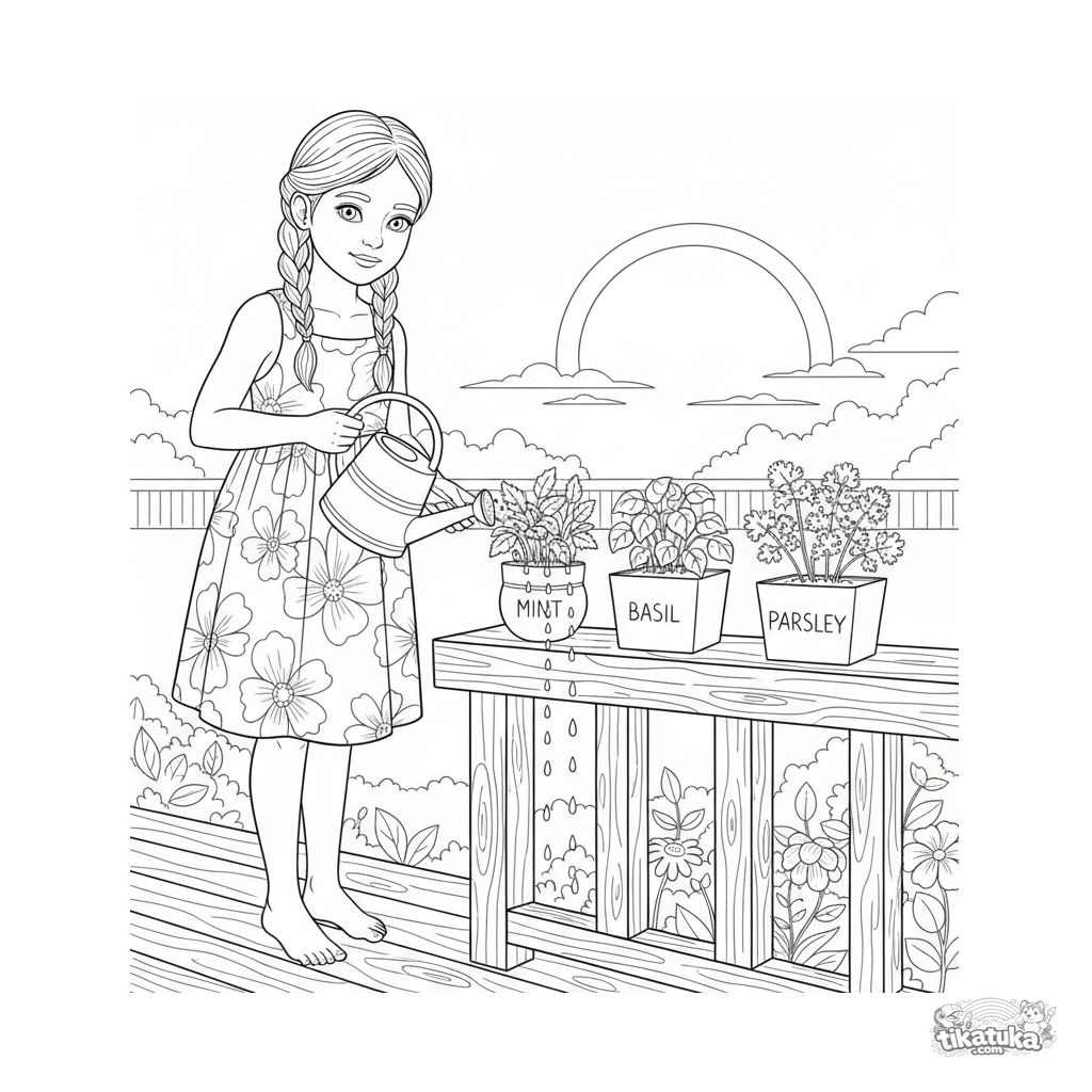 Detailliertes Ausmalbild für Kinder 10-12 Jahre: Ein Mädchen gießt Topfkräuter auf einem Datscha-Verandageländer. Saubere Umrisse, naturalistische Pflanzendetails.