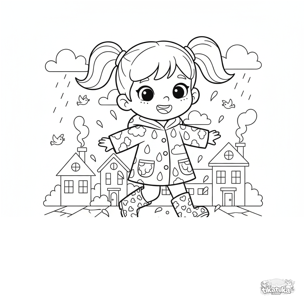 Ausmalbild für Mädchen 4-6 Jahre alt: ein fröhliches Mädchen in einer Regenjacke springt über eine große Pfütze. Eine dynamische und freudige Szene.