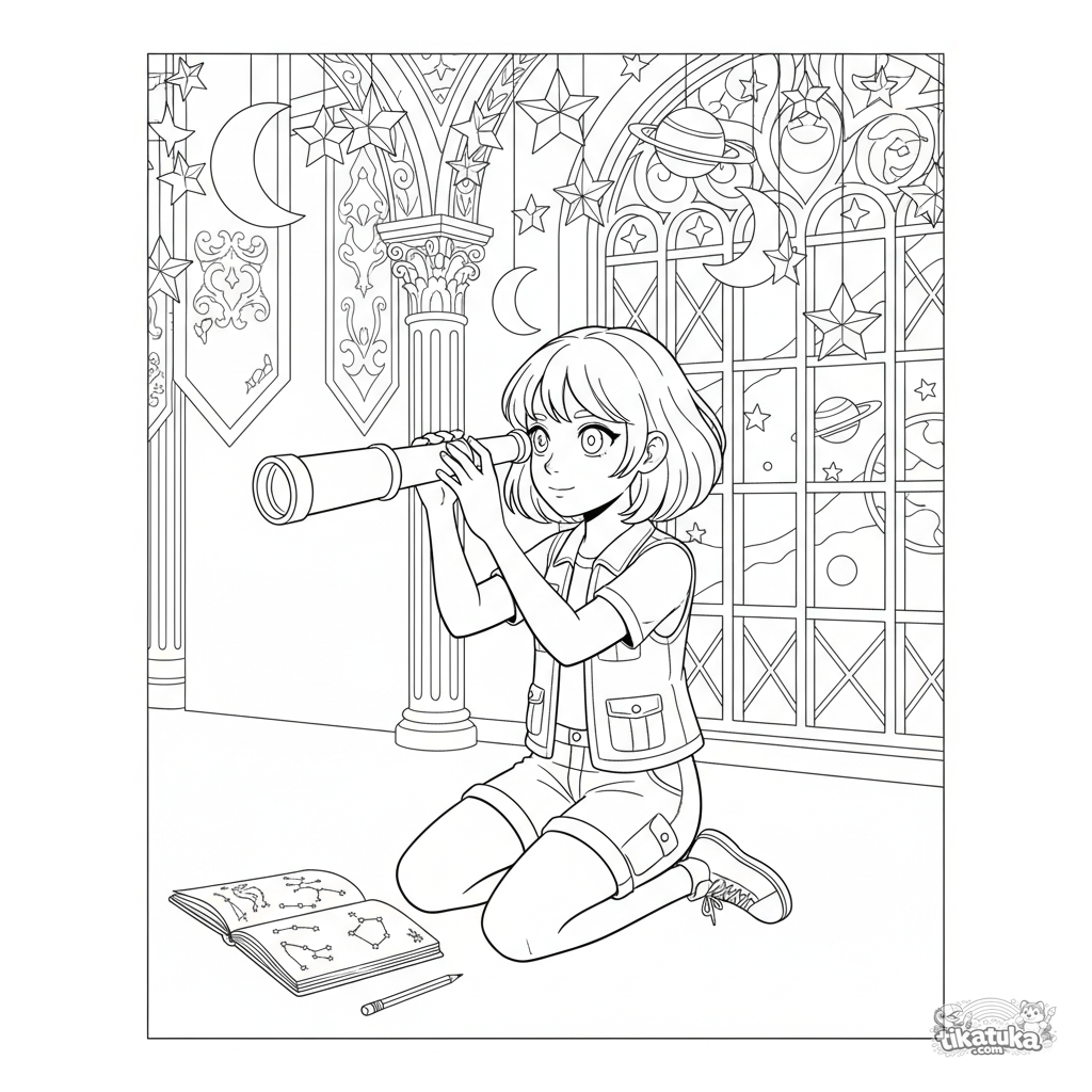 Ausmalbild für Kinder 10-12: Eine junge Forscherin in einer Weste schaut interessiert durch ein Teleskop auf die Sterne von einem Fenster im festlichen Saal aus. Detaillierte Illustration.