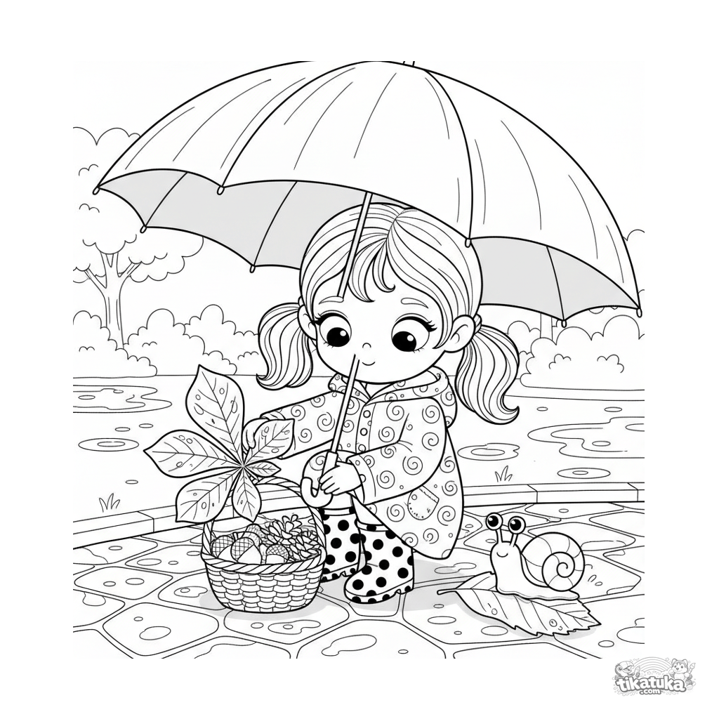 Ausmalbild für Kinder 4-6 Jahre: ein Mädchen in Regenjacke sammelt Herbstblätter unter einem durchsichtigen Regenschirm. Mäßige Detailstufe.
