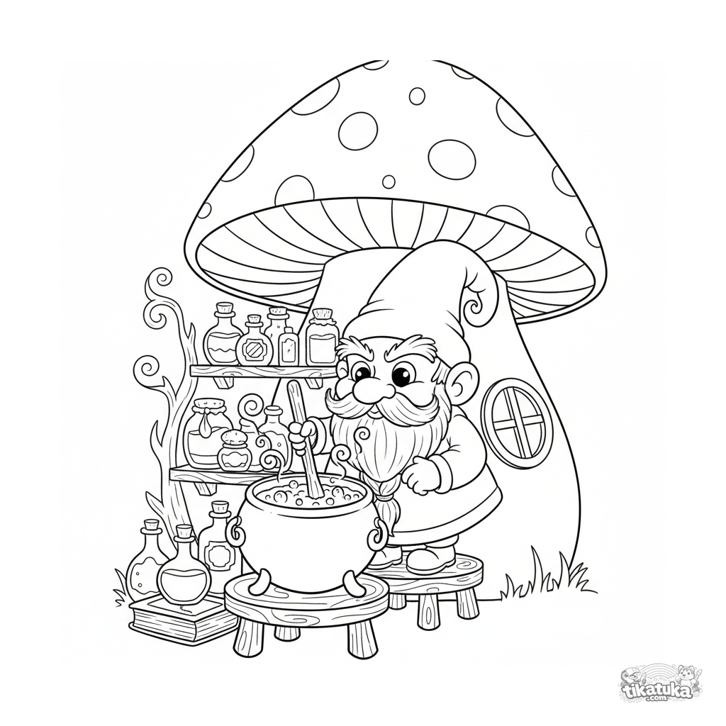Ausmalbild für Kinder 4-6: Ein Gnom-Alchemist braut einen magischen Trank in seinem gemütlichen Pilzhaus, umgeben von Gläsern und Flaschen. Lustige Fantasieszene.