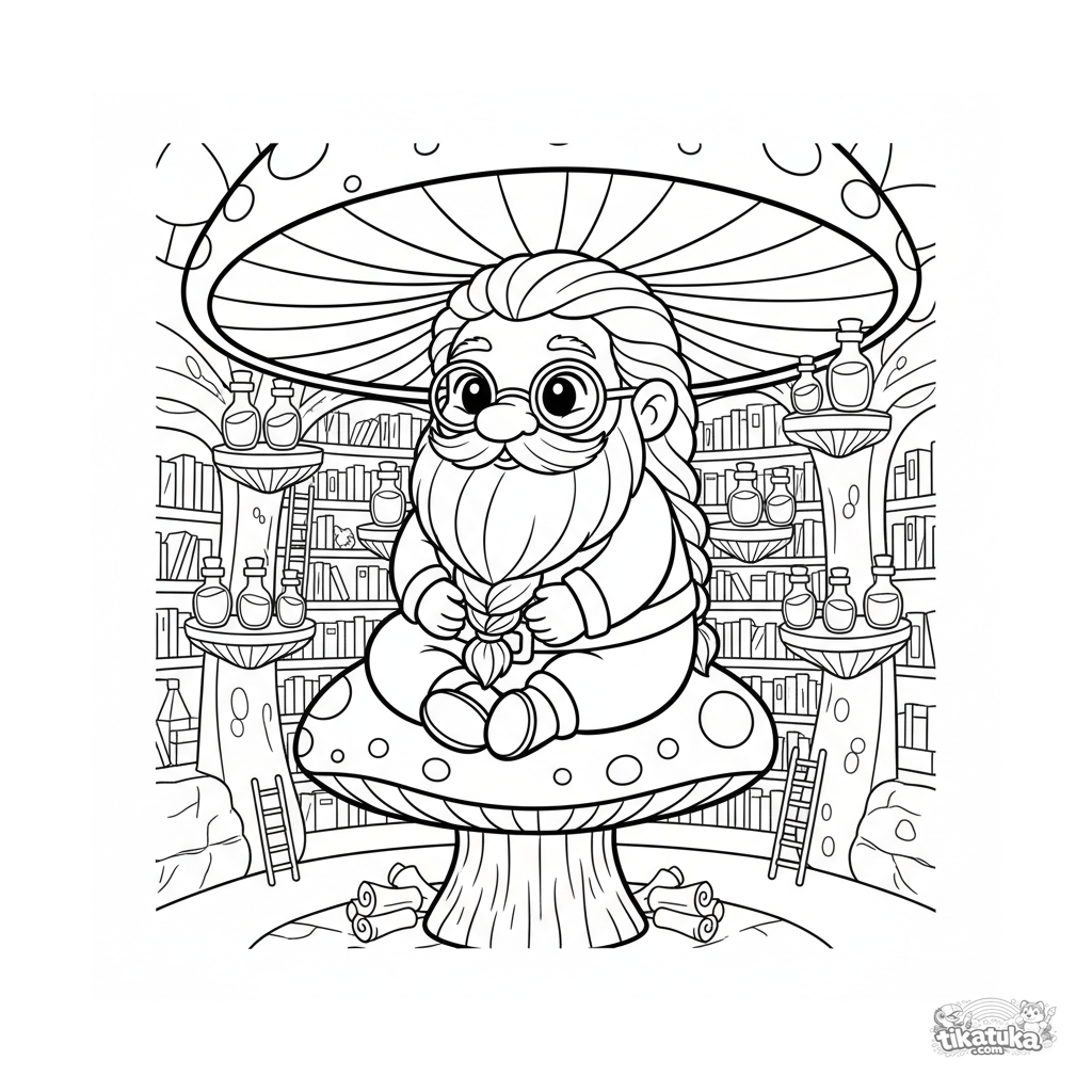 Ausmalbild für Kinder 7-9: Ein Gnom-Archivar sortiert leuchtende Erinnerungsflaschen in einer gemütlichen Bibliothek unter einer riesigen Pilzkappe.