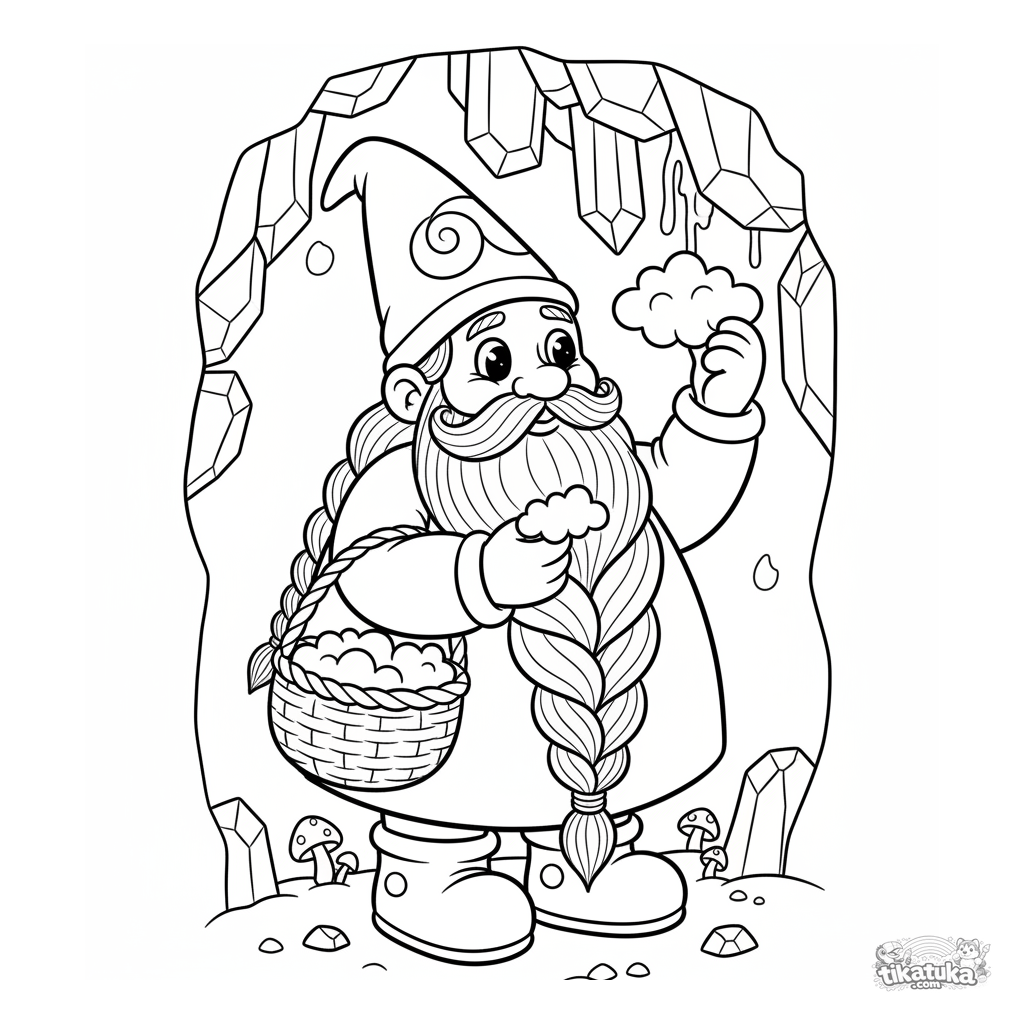 Ausmalbild für Kinder 4-6: Ein Gnom-Kräutersammler sammelt leuchtendes Moos in einer magischen Kristallhöhle. Niedliche Fantasieszene.