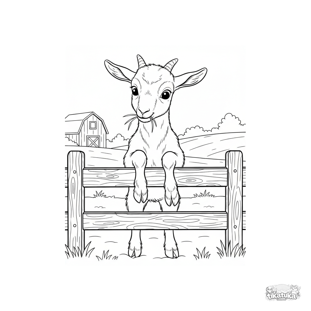 Kinder Ausmalbild: Ein neugieriges Zicklein steht auf seinen Hinterbeinen an einem hölzernen Bauernhofzaun. Süße Szene mit Hofdetails im Hintergrund.