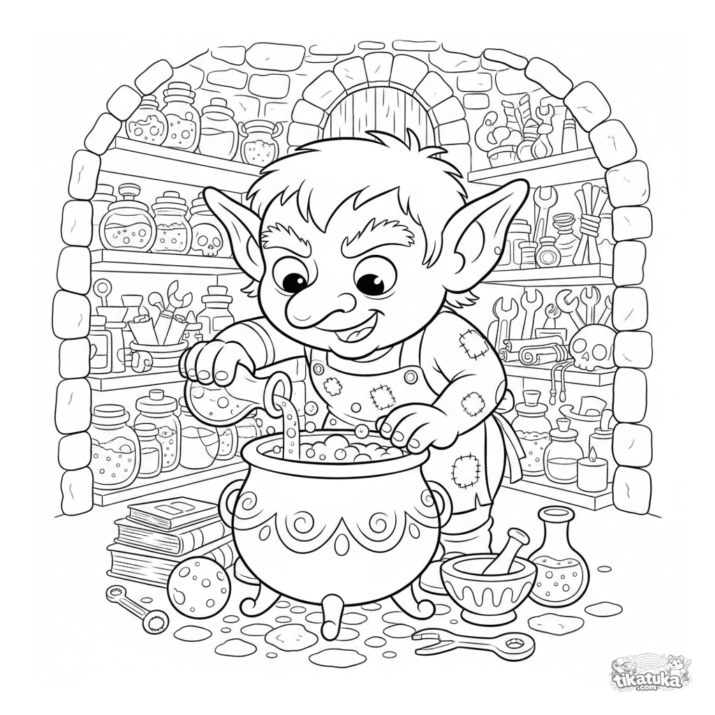 Ausmalbild für 7-9 Jahre: Ein Goblin-Alchemist braut einen magischen Trank in seiner übervollen unterirdischen Werkstatt. Lustige, detaillierte Szene im 90er-Cartoon-Stil.
