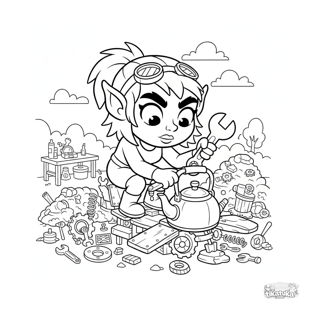 Ausmalbild für Kinder 7-9: Ein erfinderischer Kobold-Ingenieur bastelt an einer aus Schrott gebauten Flugmaschine in ihrer Schrottplatz-Werkstatt.