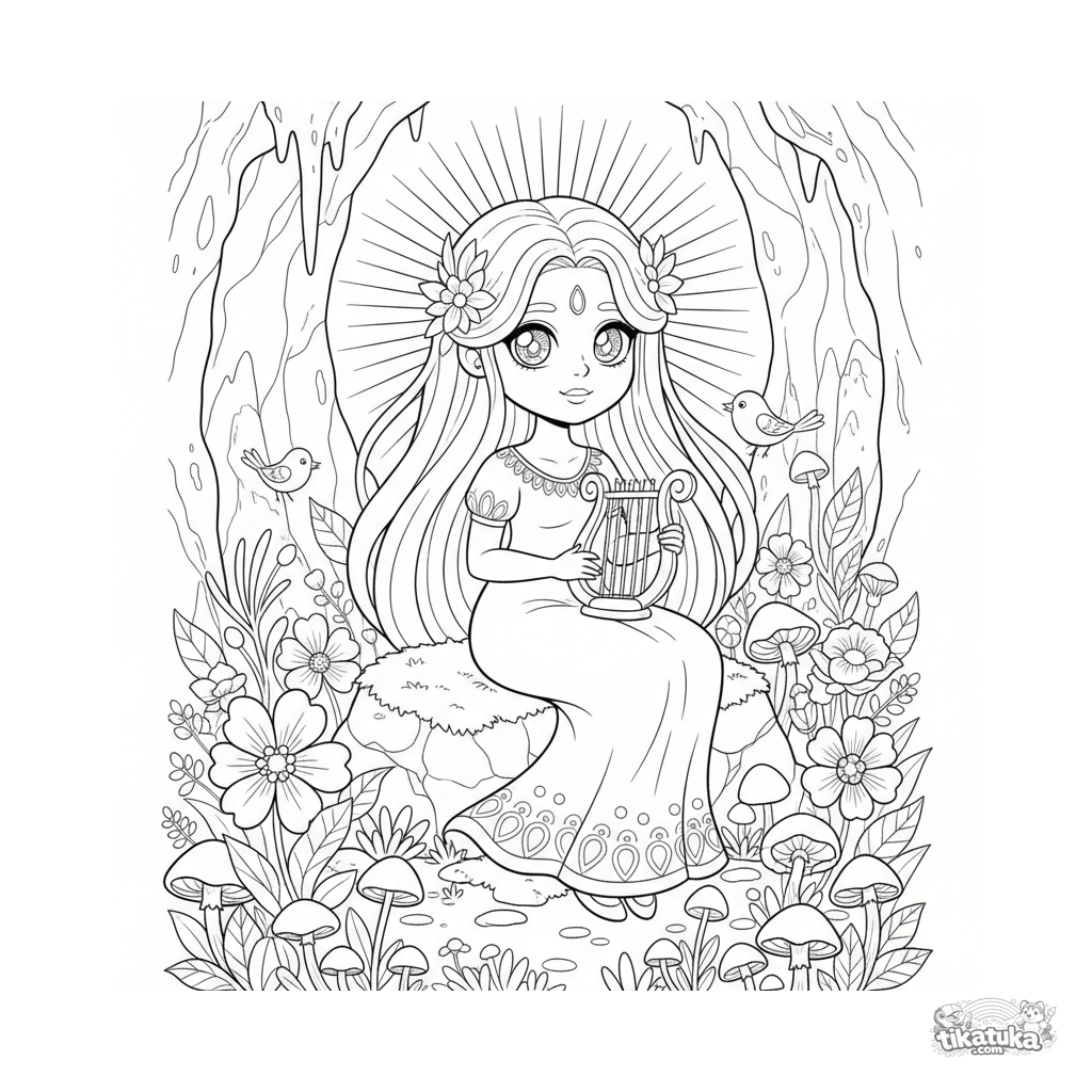 Ausmalbild für Kinder 10-12: Die Göttin der Morgenröte spielt eine Harfe in einem unterirdischen Garten in der Gorgonenhöhle, umgeben von leuchtenden Blumen. Detaillierte Szene im Stil klassischer Animation.