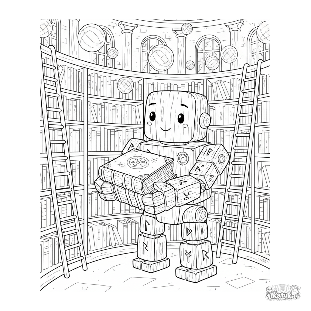 Ausmalbild für Tweens 7-9: Ein Stein-Golem-Bibliothekar sortiert sorgfältig alte Bücher in einer riesigen, runden Zauberbibliothek.