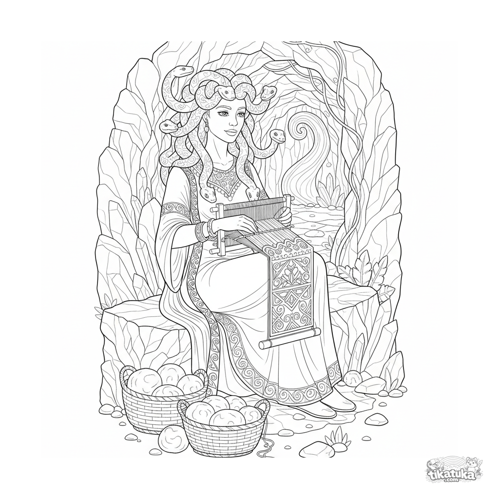 Detailliertes Ausmalbild für 10-12 Jahre: Stheno, Schwester der Medusa, webt einen Teppich in einer Felsnische. Komplexes Design mit lebendigem Schlangenhaar.