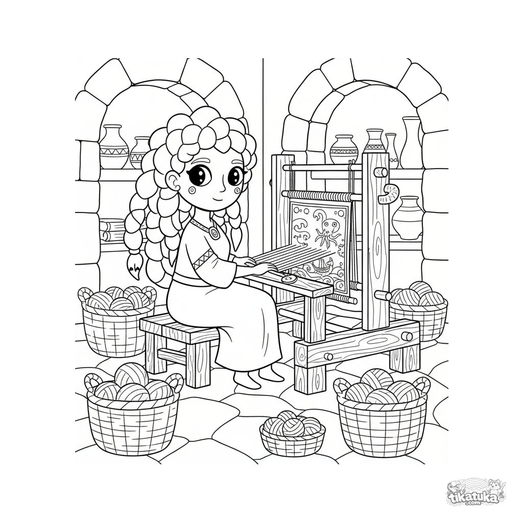 Ausmalbild für Kinder 4-6: eine der Gorgonenschwestern arbeitet an einem Webstuhl in der Steinhöhle. Heller Folk-Stil, klare Formen.