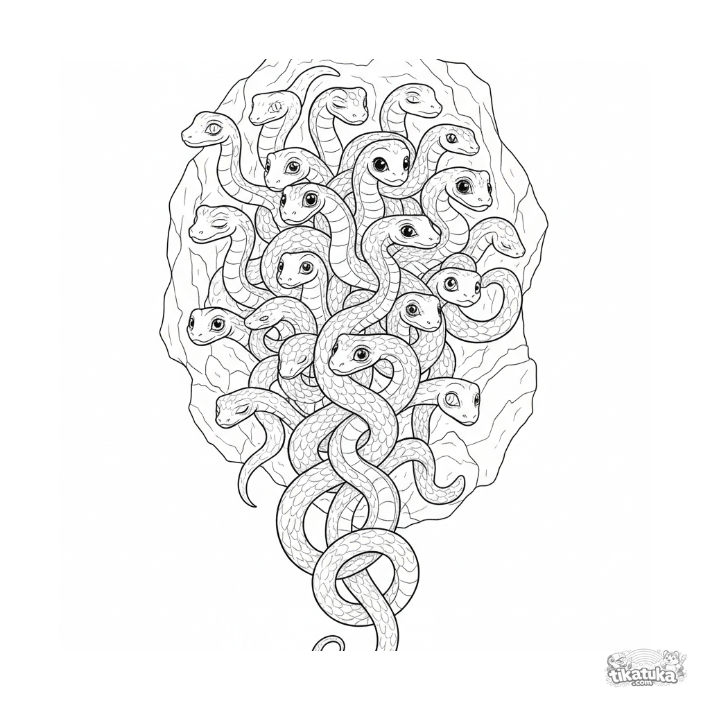 Komplexes Ausmalbild für Kinder von 10-12 Jahren: eine detaillierte Darstellung von Gorgos Schlangenhaar-Strähnen.