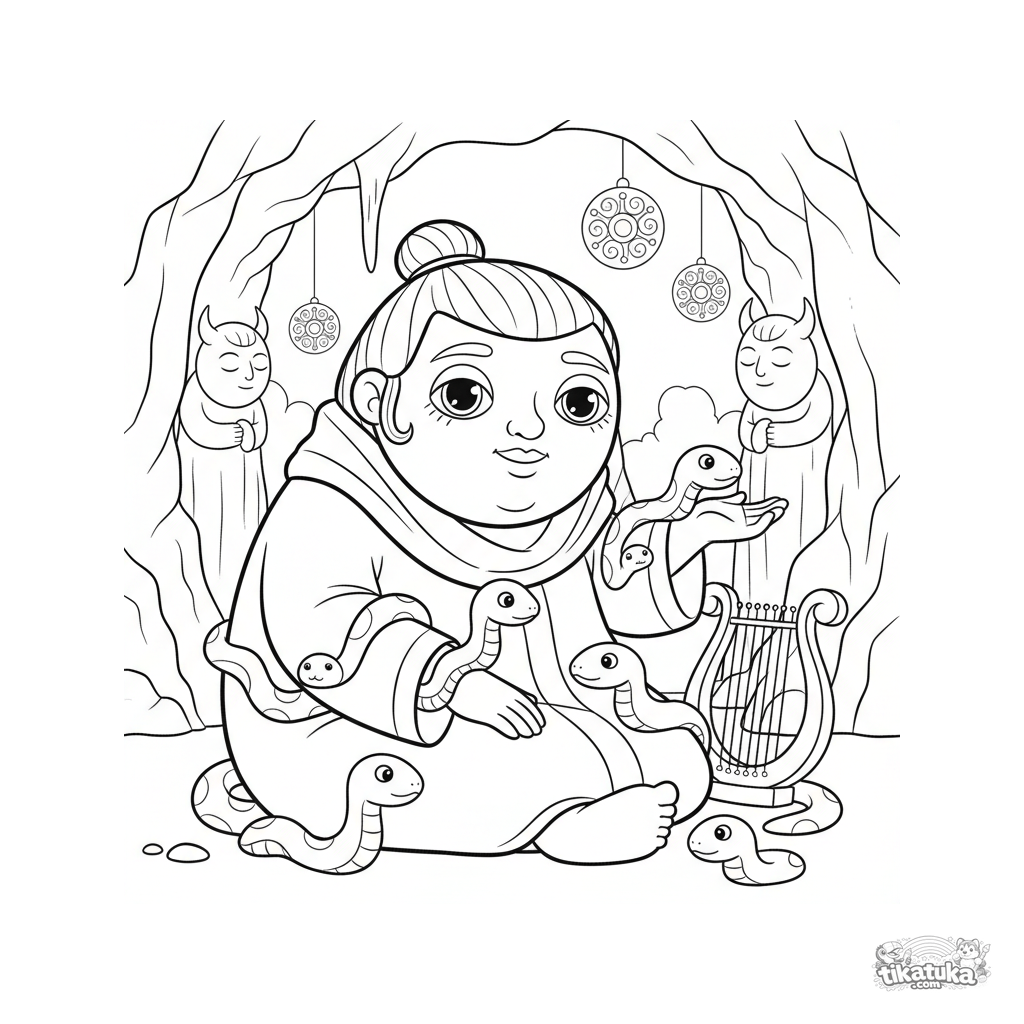 Ausmalbild für Kinder 7-9: Ein Schlangenbändiger in Medusas Gorgonenhöhle. Szene im Volksstil mit Harfe und ruhigen Schlangen.