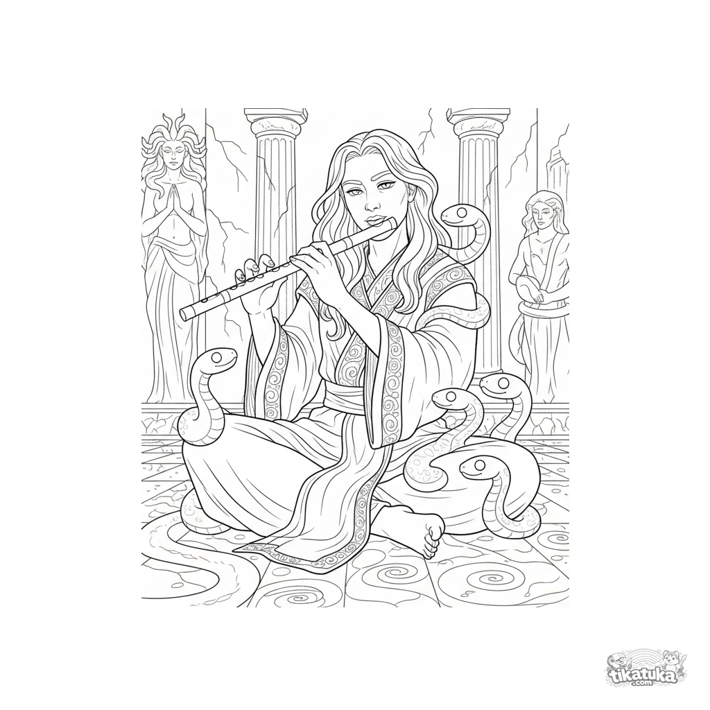 Detailliertes Ausmalbild für Kinder 10-12: Ein Schlangenbändiger spielt Flöte in der Gorgonenhöhle.