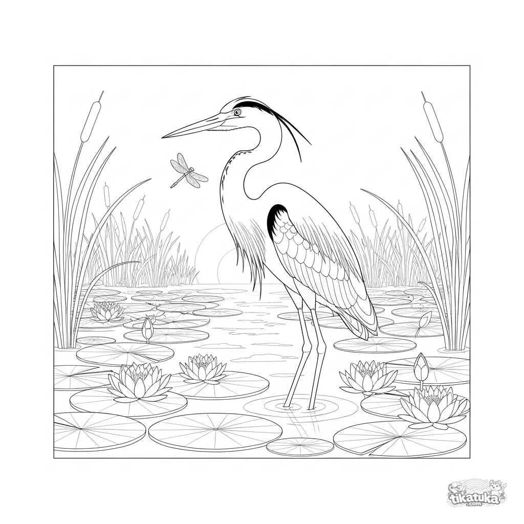 Ausmalbild eines anmutigen Reihers im Seerosen-Teich bei Sonnenaufgang. Für Kinder von 6-9 Jahren. Zeigt einen detaillierten Vogel, Seerosen, eine Libelle und Sonnenaufgangsreflexionen.