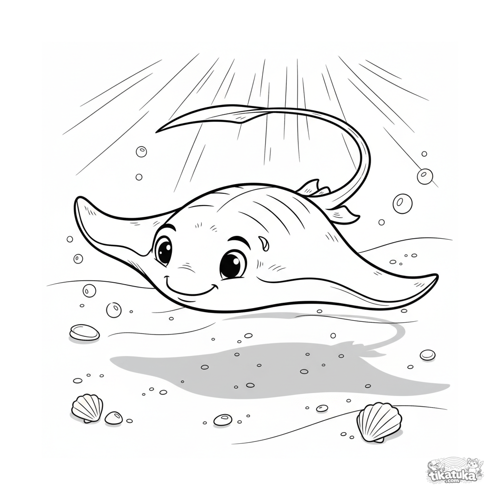 Ausmalbild für Kinder von 7 bis 9 Jahren: Ein anmutiger Stechrochen gleitet über sandigen Grund in Sonnenstrahlen im flachen Wasser.