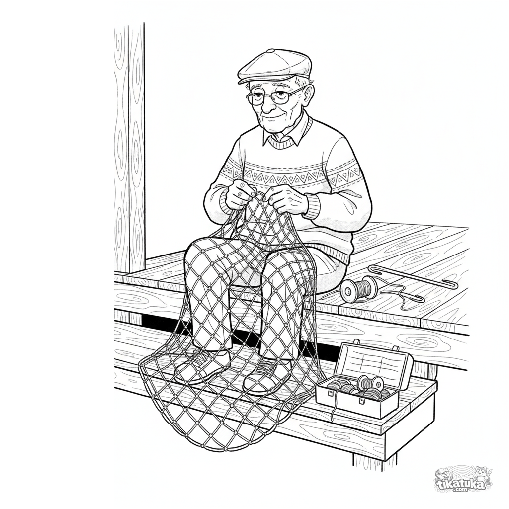 Detailliertes Ausmalbild für ältere Kinder 10-12 Jahre: Ein Opa repariert ein Fischernetz auf der Verandastufe. Komplexe Texturen und friedliche Atmosphäre.