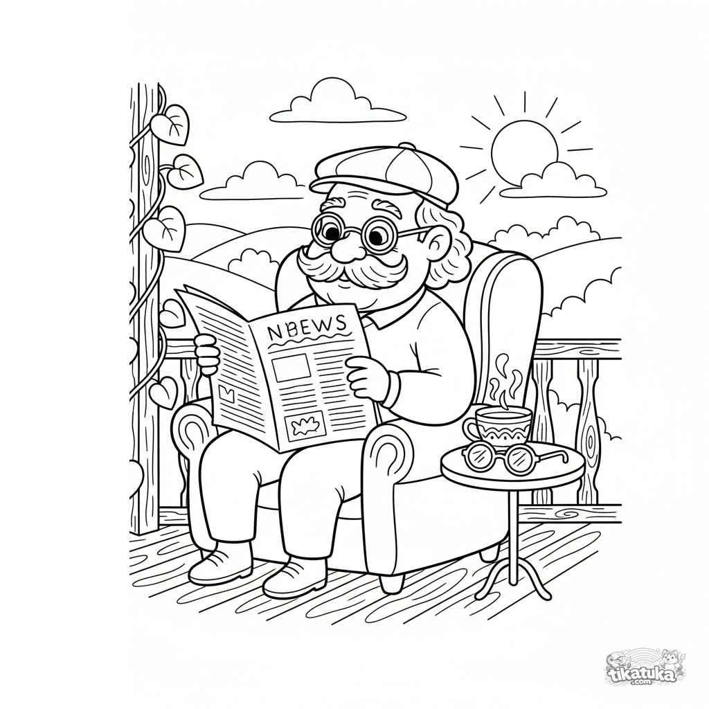 Ausmalbild für Kinder 7-9: Opa liest Zeitung auf der Veranda, eine Tasse Tee in der Nähe. Gemütliche, detaillierte Szene im Folk-Stil.