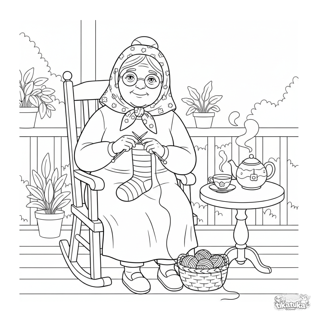 Ausmalbild für Kinder 7-9: eine gemütliche Oma strickt Socken in einem Schaukelstuhl auf einer Datscha-Veranda.