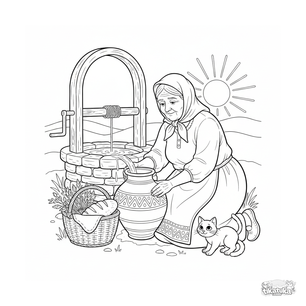 Ausmalbild für Kinder 4-6: Eine freundliche Großmutter in Volkstracht füllt einen Krug mit Wasser vom Brunnen. Szene im Linolschnitt-Stil mit einer Katze und einem Korb.