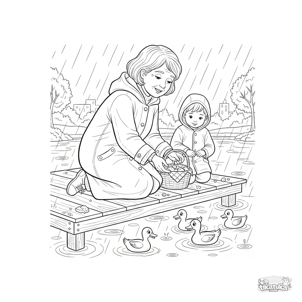 Komplexes Ausmalbild für ältere Kinder 10-12 Jahre: eine berührende Szene von Großeltern und Enkelkind in Regenmänteln, die Enten von einem Holzsteg in einem herbstlichen Parkregen füttern. Detaillierte Linienführung, stimmungsvoll.
