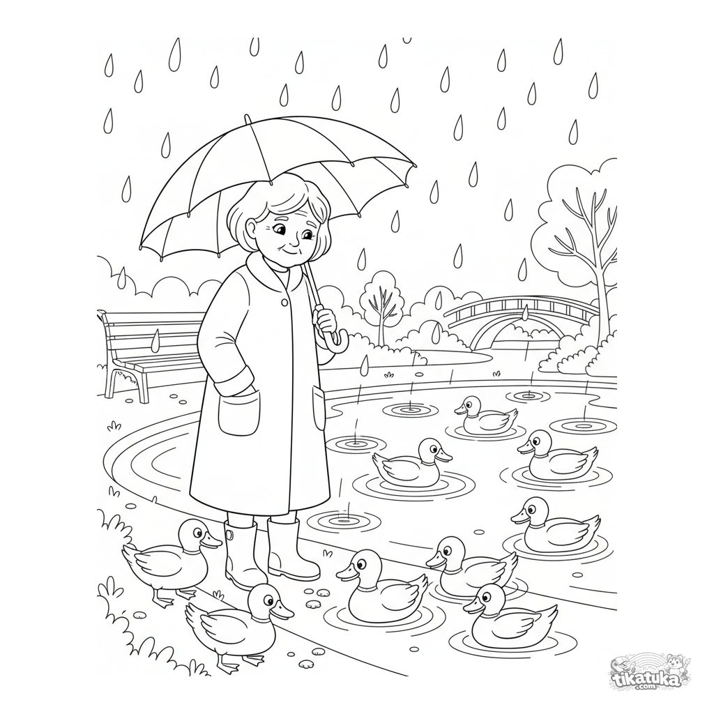 Ausmalbild für Tweens 7-9 Jahre: ein Großelternteil mit Regenschirm füttert Enten an einem Herbstteich in einem regnerischen Park. Ausdrucksstarke Pose, mäßig detaillierter Hintergrund.
