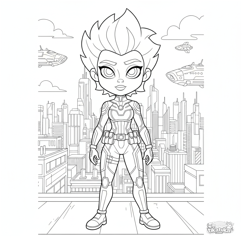 Cooles Graphic-Novel-Ausmalbild für 10-12 Jahre: Eine Heldin im detaillierten Sci-Fi-Overall steht auf einem Dach in einer futuristischen Stadtkulisse.