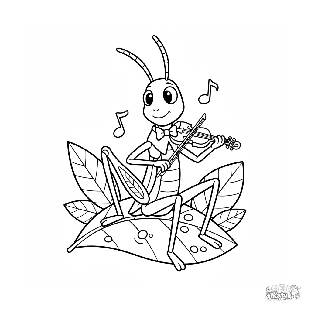 Retro-Stil Ausmalbild für 7-9 Jahre: ein eleganter Grashüpfer mit Fliege spielt Geige, während er auf einem Blatt mit Tau sitzt.