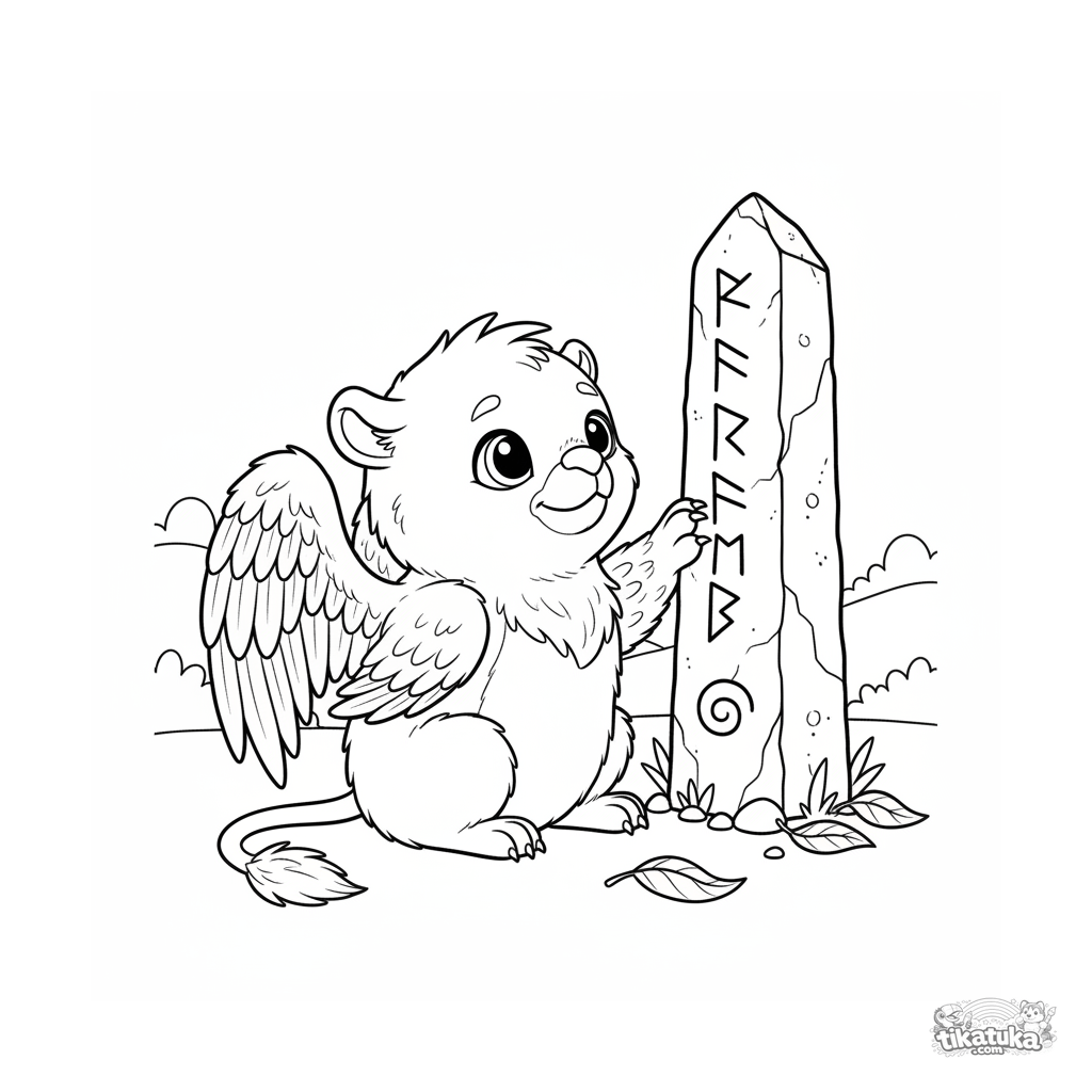 Ausmalbild für Kinder 4-6: Ein flauschiges Greif-Küken studiert neugierig alte Runen auf einem Monolithen. Niedliche, einfache Szene zum Ausmalen.
