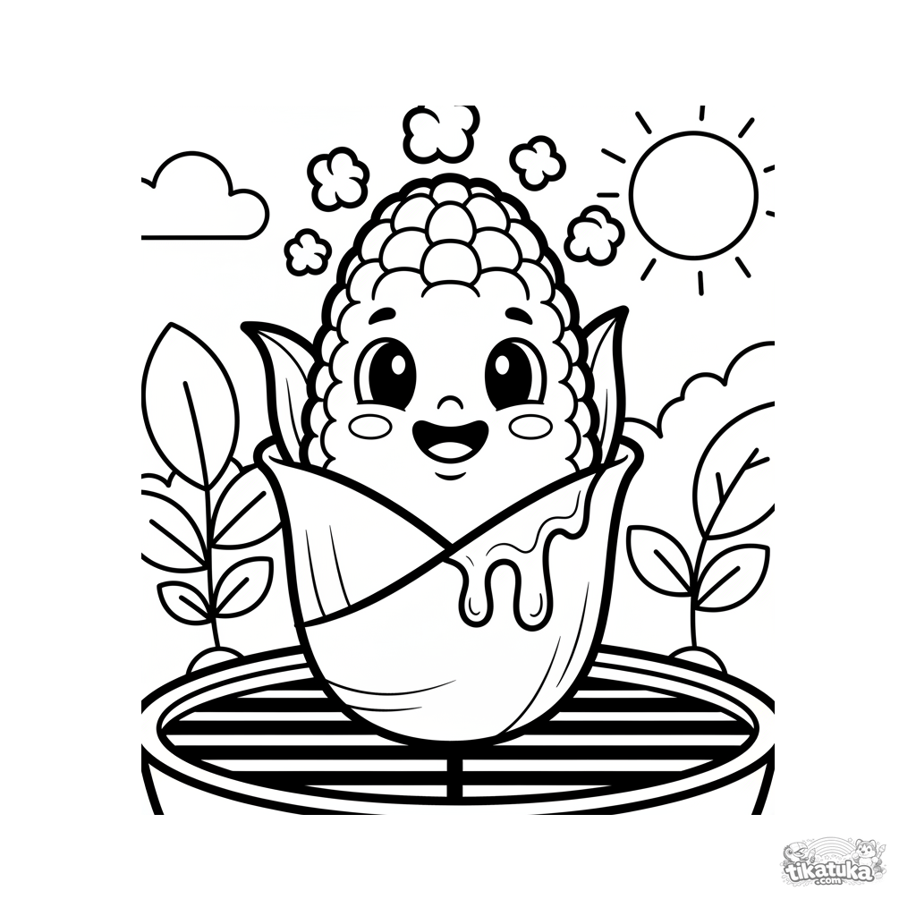 Ausmalbild für Kleinkinder: ein fröhlicher Maiskolben auf einem Gartengrill. Einfache, große Formen mit breiten Rändern für Kinder von 2-3 Jahren.