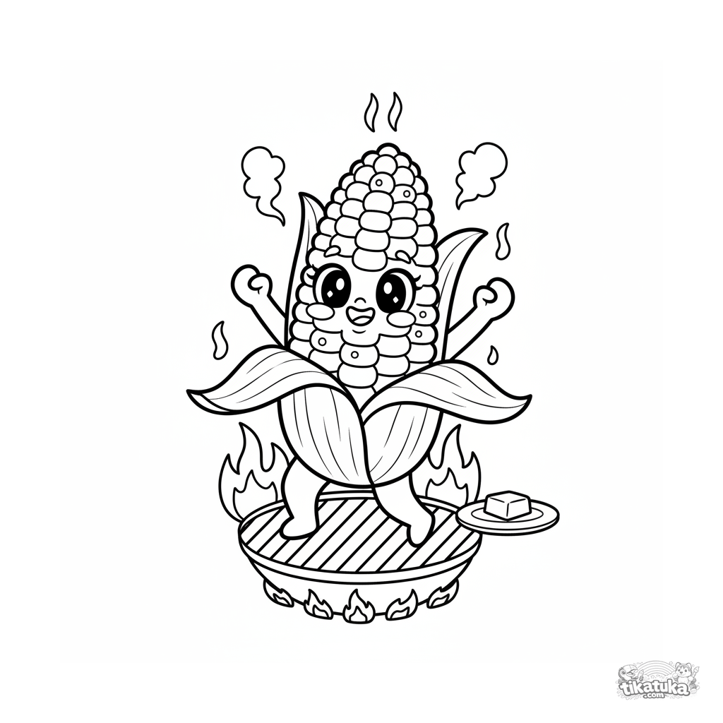 Ausmalbild für Kinder 7-9: Eine fröhliche Maiskolben tanzt auf einem Grillrost. Dynamische Pose, Sommer-Picknick-Atmosphäre.