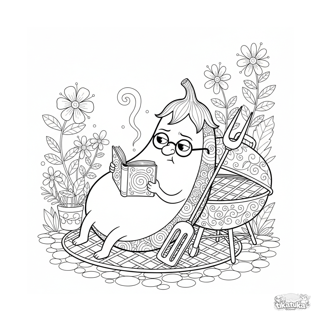 Detailliertes Ausmalbild für Kinder von 10-12 Jahren. Eine Auberginenscheibe mit Brille liest ein Buch, während sie auf einem Gartengrill entspannt. Lockere Umrisse, Aquarellskizzen-Stil.