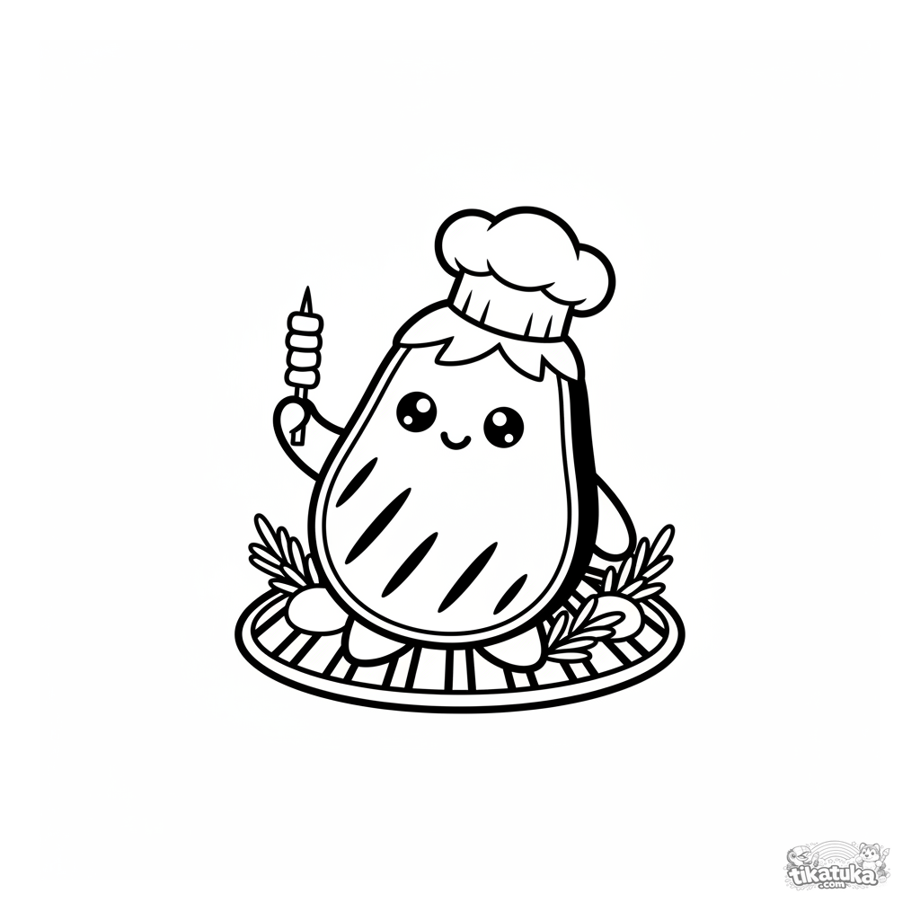 Ausmalbild für Kleinkinder: eine fröhliche Auberginenscheibe mit Kochmütze auf einem Gartengrill. Einfache Formen, breite Ränder.