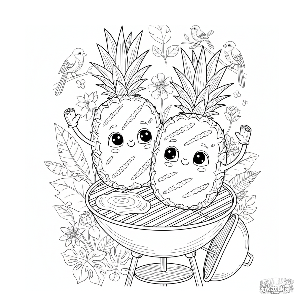 Detailliertes Ausmalbild für Kinder 10-12: realistische gegrillte Pfirsichhälften mit Zimtstangenarmen auf einem Gartengrill. Kostenlose druckbare Kunst.