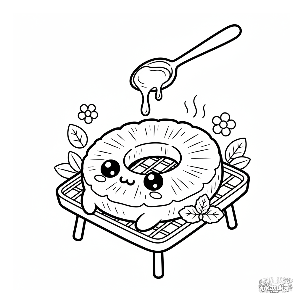 Ausmalbild für Kinder 7-9: Ein süßer Ananasring auf dem Grill mit Karamellfäden. Mäßiges Detail, ausdrucksstarkes Gesicht.