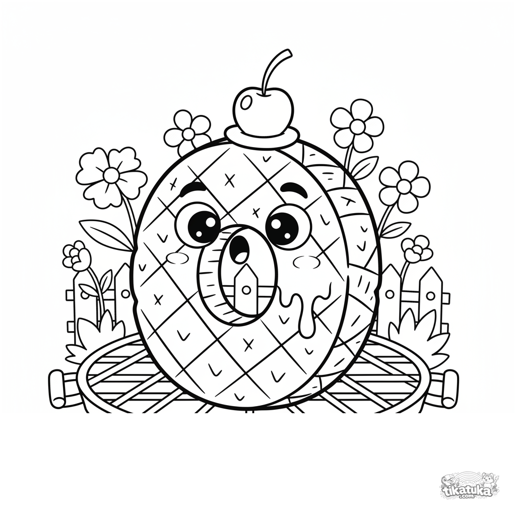 Ausmalbild für Kinder 4-6 Jahre: ein überraschter Ananasring mit Kirschhut auf einem Gartengrill.
