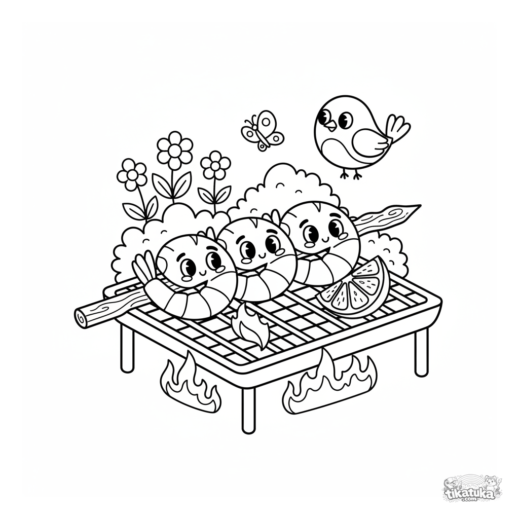 Ausmalbild eines gegrillten Garnelenspießes im Garten. Drei Garnelen mit Zitronenspalte. Für Kinder von 7 bis 9 Jahren.