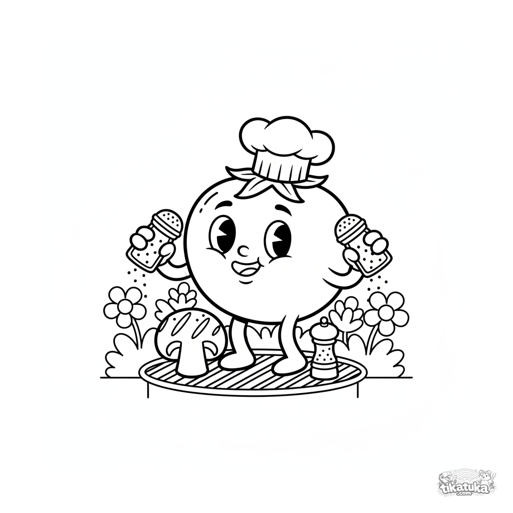 Ausmalbild für Kinder von 4-6 Jahren. Eine pralle Tomate mit Kochmütze steht auf einem Grill und würzt sich selbst und einen Pilz. Lustige Szene.
