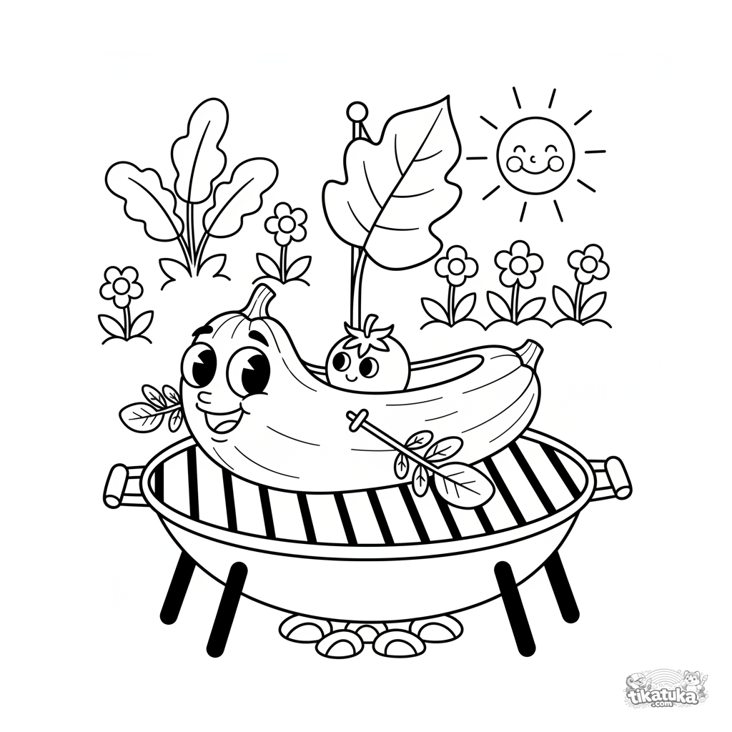 Ausmalbild für Tweens von 7-9 Jahren. Eine Zucchini in Bootsform mit einem Blatt als Segel segelt über einen Gartengrillrost. Ein Cocktailtomaten-Passagier sitzt darin.