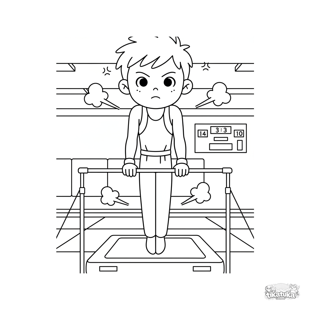 Ausmalbild für Kinder: Ein Turner trainiert am Reck in der Turnhalle. Für 4-6 Jahre, eine klare Szene zum Ausmalen.