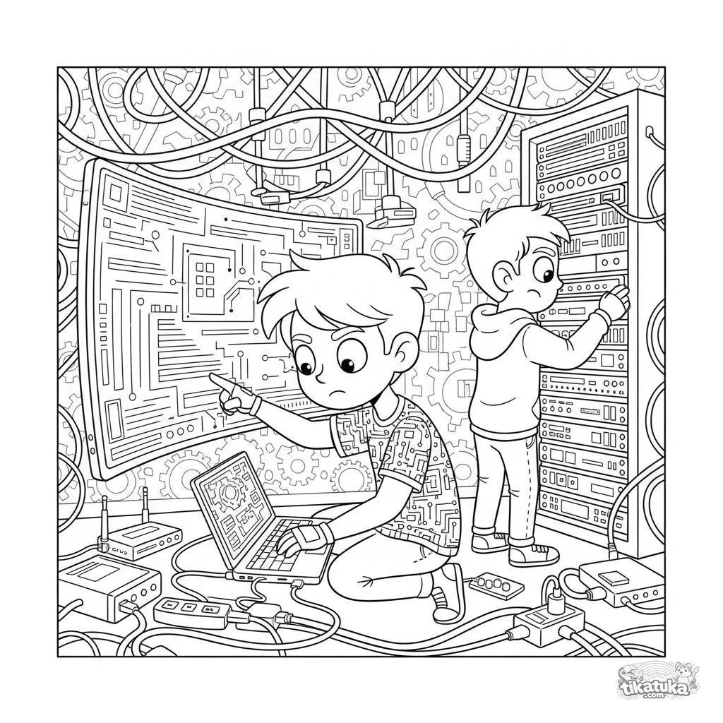 Ausmalbild für Kinder von 10-12 Jahren: Ein Hacker-Duo im Keller mit Bildschirmen, das an Code arbeitet. Komplexe Szene mit Kabeln, Servern und detailliertem Hintergrund.